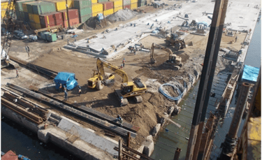 Construction of new wharf and bulkhead to accommodate deeper berth consisting mainly of driving new steel sheet piles located further from existing wharf line. The project also extended the length of the pier by 55.4m.
